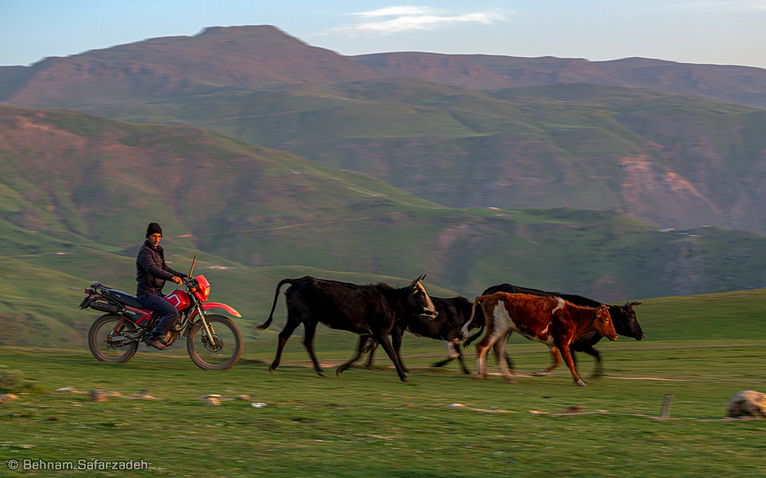 Cowboy herding cattle with a motorcycle in the highlands of Gilan Province, Iran.