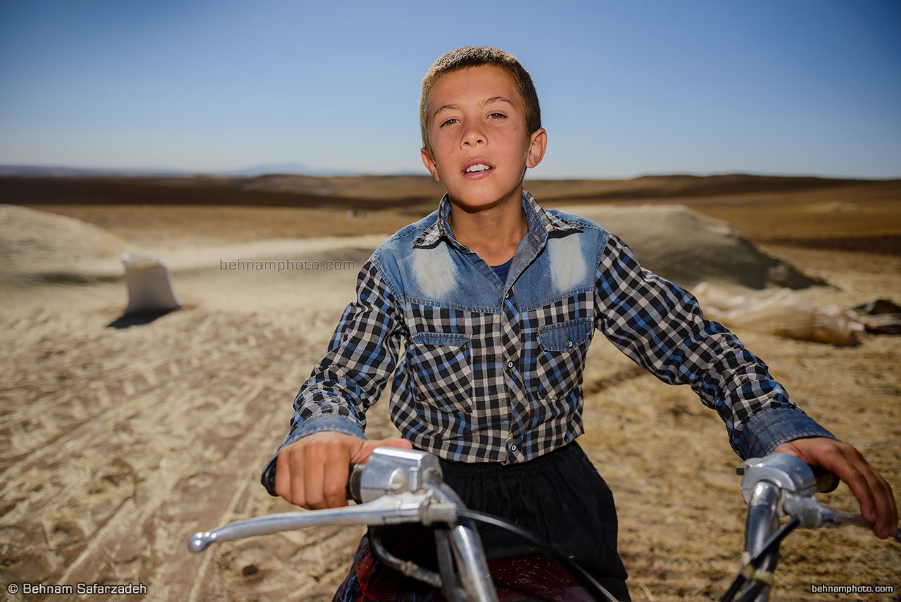 Mahdi, 12, riding his motorcycle around farms. Zanjan Province, Iran